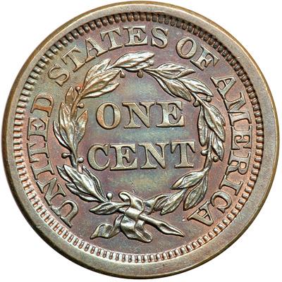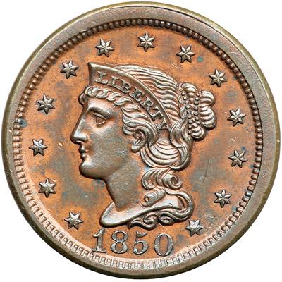 1850 N-17 R4. AU-50. Sharpness very close to mint state but this cent was lightly cleaned and has retoned glossy light olive with faded red in protected areas, mostly on the obverse. There is a small spot of darker toning at the throat, a dull pinprick in the field off the tip of the nose, and a thin nick in the field right of the inner curl. The reverse is choice and lustrous with mint state eye appeal, but the obverse would benefit from a better retoning. Sharply struck EDS, die state a. The obverse displays fine die polishing lines in the fields. Tied for CC#7.