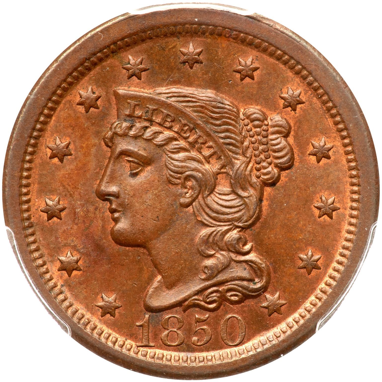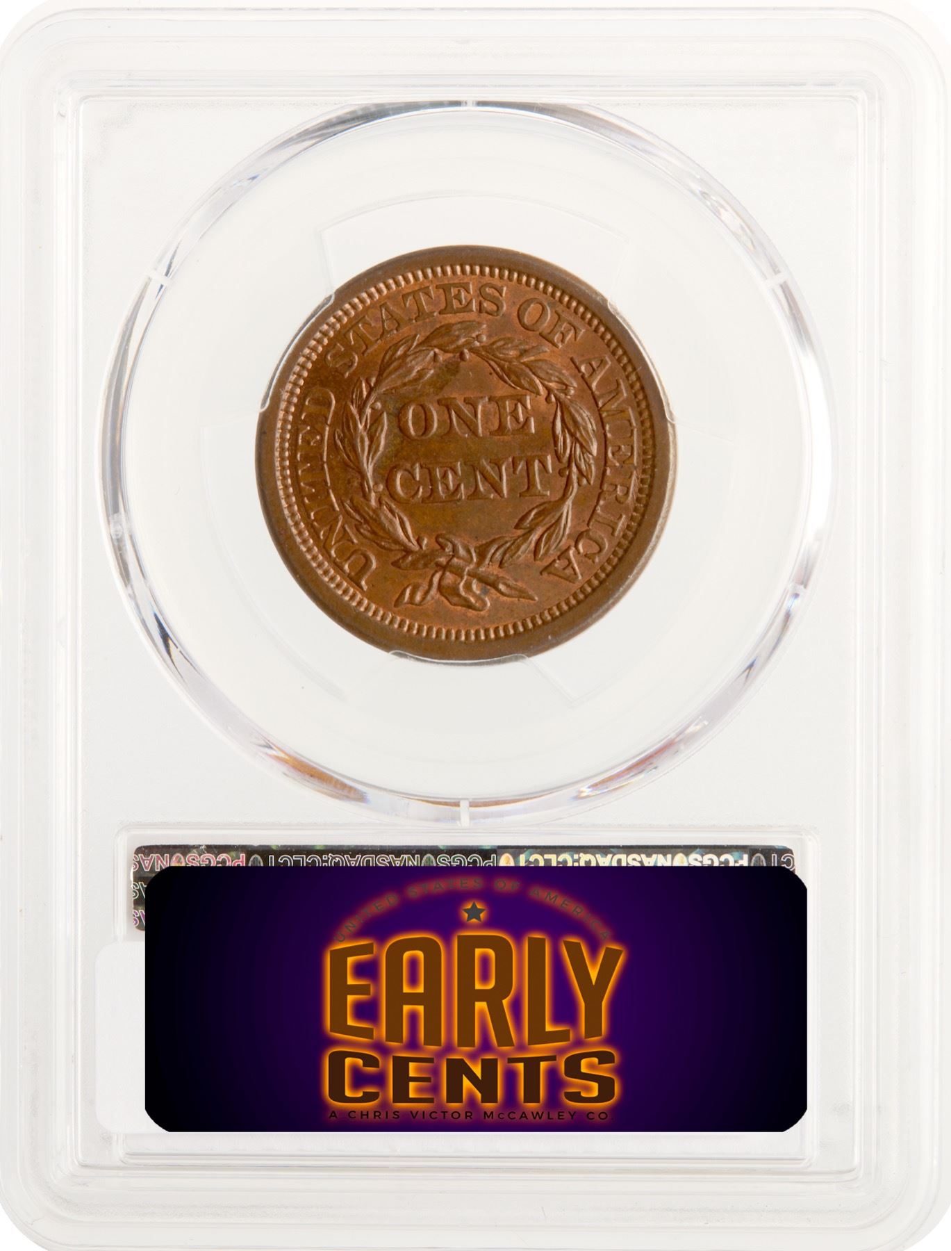 Lustrous light olive and steel brown with 20% of the mint red remaining, mostly on the reverse (a 10/30% split). An attractive cent with just a few minor marks including a small spot at the bottom of the eye (easily missed), a small puff of darker steel toning (not carbon) under the right side of the 8, and another at the right top of the 1. EDS, die state a. All the fine die lines are sharp. Our grade is MS60+, tied for CC#5 in the Grellman census.
