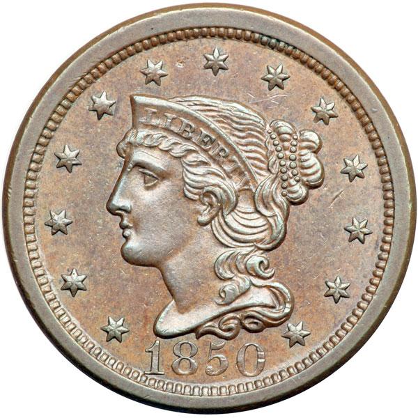 1850 N-18 R4 AU55. Lustrous light steel brown. The only marks are a light diagonal nick under star 10, a tiny planchet flake right of star 6 (as struck), and a spot of reddish toning on the right side of the E in ONE. Sharp EDS, die state a, the earliest seen, with fine die polishing lines covering slightly reflective fields. The die lines at the dentils over star 7 are sharp. Tied for CC#6 in the Grellman census. DWH #2143.