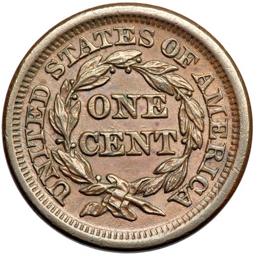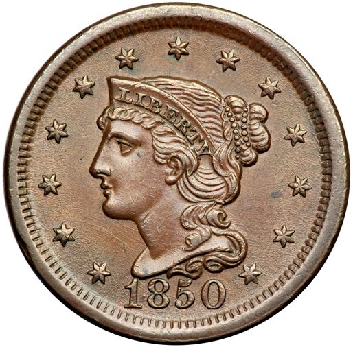 1850 N-19 R1 EF45. Five points sharper but there is a fine hairline scratch arcing in the field between the chin and star 2 and a dull nick on the throat. Attractive glossy medium brown and light chocolate. Satiny mint frost covers the protected areas on both sides. MDS, die state a late. The stronger die lines on the obverse are still visible and the lump between the 1 & 8 (actually the top of a stray 1) is dull.