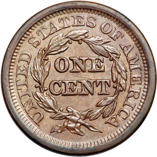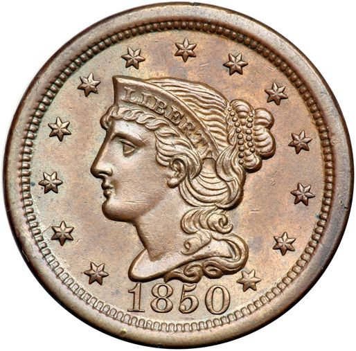 1850 N-2 R1 AU58. Frosty medium brown and light chocolate. Satiny mint luster covers the fields and protected areas on both sides. Just a hint of friction on the highest points from mint state. The only notable mark is a thin scratch on the edge under the 8 in the date (not visible from either side). MDS, die state d. The die crack at TED is clear and lapping has removed most of the die lines from behind ONE CENT.