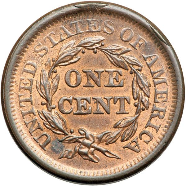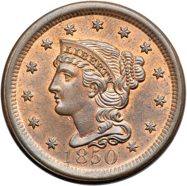 1850 N-21 R2+ MS63. Mellowed mint red fading to steel brown, about half the red remaining. Would rate a slightly higher grade except for a spot of darker toning between the U and end of the wreath ribbon, and this spot has been lightly abraded to minimize its visibility. Otherwise a tiny planchet chip in the field close to the throat, as struck, is the notable mark. LDS, die state c, with a pair of rim cud breaks on the reverse (Newcomb’s #10). The cuds are strong on this example, which is often not the case. Most likely from the large hoard of mint state examples in this die state dispersed by Abe Kosoff long ago. DWH #1096.