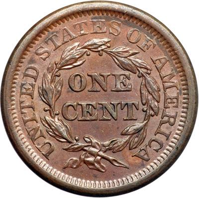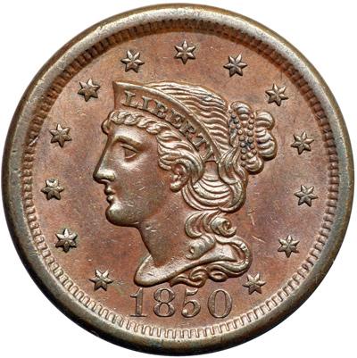 1850 N-22 R3+. AU-50 Plus. Frosty chocolate and steel brown with a thin swipe of darker chocolate and olive toning at the top of ES-OF-AM. Satiny mint frost covers the fields and protected areas on both sides. Close to AU55. MDS, die state b. The tiny die lines from the dentils under star 1 are gone but the elongated lump on the bust tip is clear.
