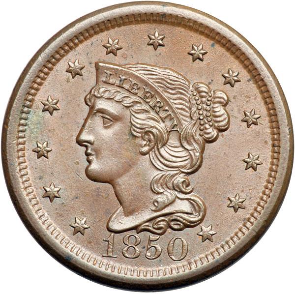 1850 N-22 R4 MS62. Lustrous light steel brown with overtones of bluish steel and generous traces of mint red remaining on the reverse. There is a patch of slightly darker bluish steel toning at the dentils over star 3, a tiny nick in the field off the chin, and a small spot of carbon right of the T in CENT. LDS, die state c late, with flowlined fields and a strong lump on the middle leaf under U in UNITED. CC#5 in the Grellman census. DWH #2145.