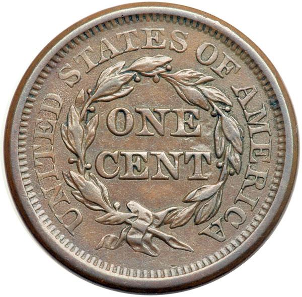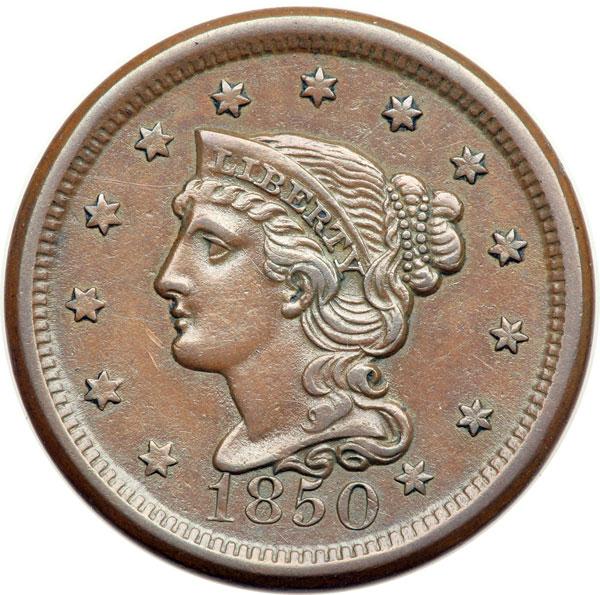 1850 N-3 R1 VF35. Choice glossy medium brown. Smooth and very attractive for the grade. A thin, light scuff in the field before the chin is the notable mark. LDS, die state c. The die lines are gone, including the vertical one inside the E in CENT, and the strike is a bit weak on the coronet tip and opposing area at the bottom of the wreath. DWH #1090.