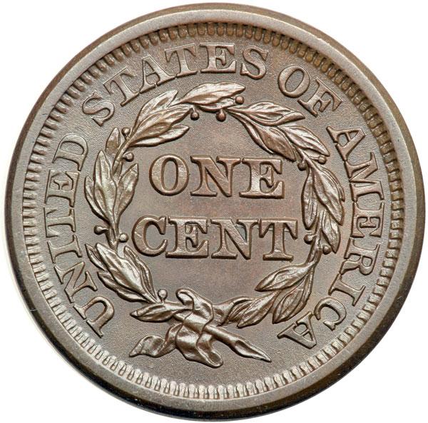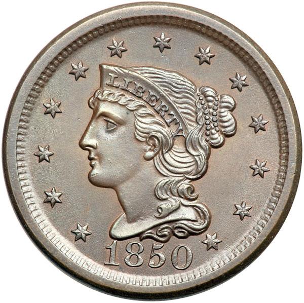 1850 N-4 R1 MS62. Lustrous bluish steel brown, a lighter shade of brown inside the wreath, with hints of very faded underlying mint red on the obverse. Covered with attractive satiny mint frost. There is a speck of carbon on the bottom of the front edge of the eyeball and another on the temple, plus a light tick on the chin and one on the coronet over the L. Sharply struck EDS, die state a, with a fine die line joining star 9 to the dentils above. Outstanding luster and eye appeal for the grade. Tied for CC#4. Removed from an NGC slab graded MS64BN (NGC label included). DWH #2136.