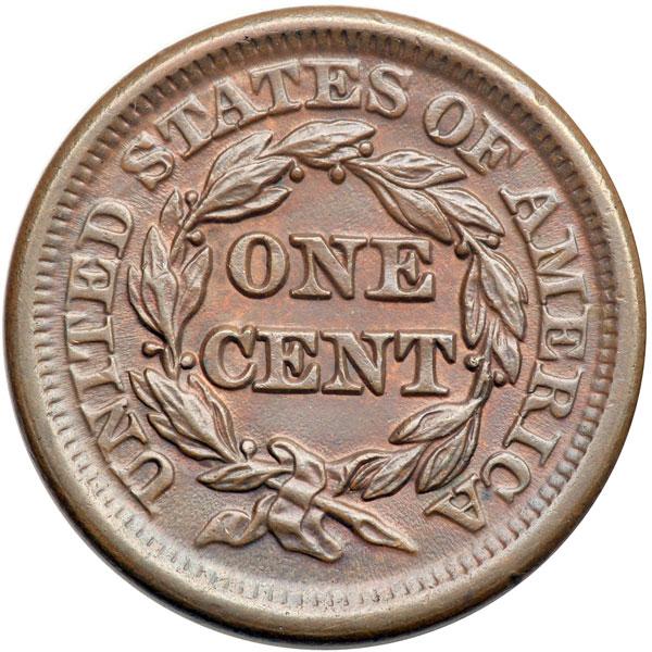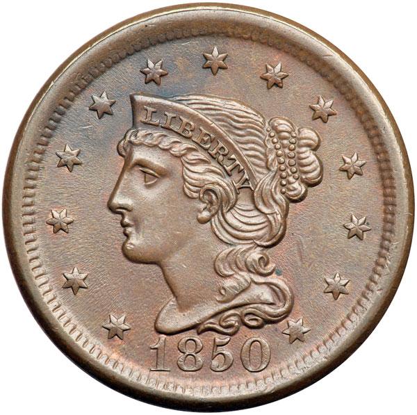 1850 N-5 R4+ AU58. Lustrous light bluish steel brown with a splash of darker steel brown toning at the coronet tip and traces of very faded mint red in protected areas. A vertical nick in the field right of the inner curl and a tiny rim nick at the second A in AMERICA are the notable marks. M-LDS, die state b. The fields are flowlined and the extra segment of the die line down from the inner hair bun is gone. DWH #1092.