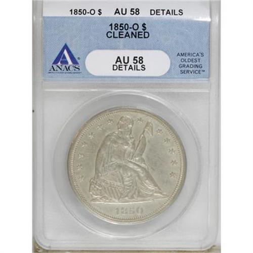 <B>1850-O $1 --Cleaned--ANACS. AU58 Details.</B></I> Light golden-gray surfaces reveal faint hairlines, and just a few other minute contact marks. A well executed strike brings out fairly good definition on the design features. The front of the ANACS holder exhibits several diagonal cracks.<BR><BR><B>Coin Engraver:</B> Christian Gobrecht<BR><BR><b>Shipping:</b> Coins & Currency (<a target="_blank" href="http://www.heritageauctions.com/common/shipping.php">view shipping information</a>)