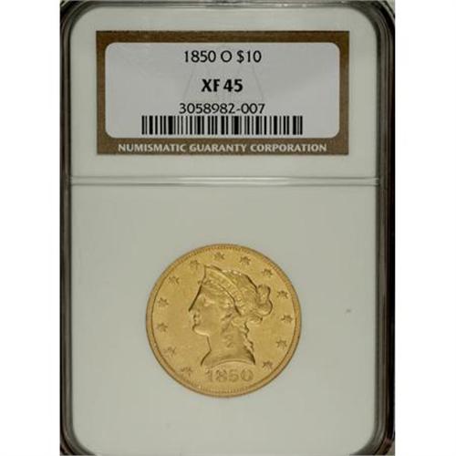 <B>1850-O $10 XF45 NGC.</B></I> This luminous straw-gold eagle displays luster within protected areas of the design. The devices have only moderate wear, and there are no individually relevant marks. A scarcer New Orleans No Motto issue.<BR><BR><B>Coin Engraver:</B> Christian Gobrecht<BR><BR><b>Shipping:</b> Coins & Currency (<a target="_blank" href="http://www.heritageauctions.com/common/shipping.php">view shipping information</a>)