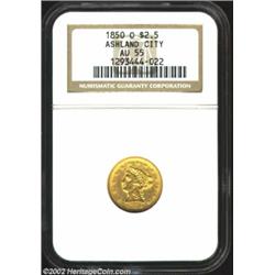 1850-O $2 1/2 AU55 NGC. Satiny with a delicate reddish tinge over both sides and softness on the central devices that is especially pronounced on the eagle's feathers. The mintage of this more difficult New Orleans issue of 84,000 pieces belies its scarcity in Uncirculated grades. From the Ashland City Collection. Important notice: We expect to be auctioning lots at the rate of 200-250 per hour. Sometimes eBay Premier live bid software cannot keep up with that pace, so we strongly recommend that you place a realistic proxy bid now as insurance to avoid disappointment. Also please note that all Heritage/CAA lots purchased through eBay Premier carry a 20% Buyer's Premium. Please make sure you read the Terms and Conditions.