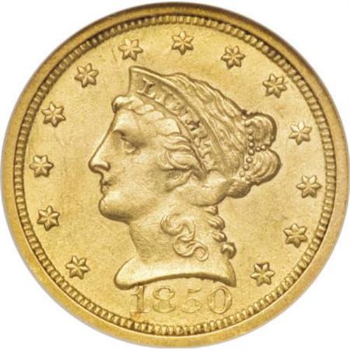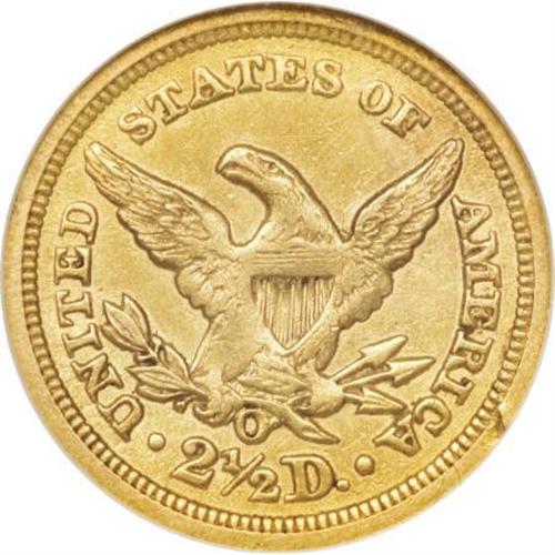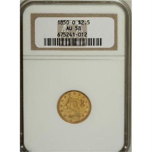<B>1850-O $2 1/2 AU58 NGC.</B></I> The central portions of this issue are notoriously poorly struck, and remaining luster must be used in grading, not strike. This piece retains nearly all of its original luster, even though both sides are quite soft in the centers; the obverse even appears somewhat "dished" at Liberty's cheek. The surfaces are fairly prooflike, with lovely orange-gold coloration. NGC has graded 16 pieces finer (3/08).<BR><BR><B>Coin Engraver:</B> Christian Gobrecht<BR><BR><b>Shipping:</b> Coins & Currency (<a target="_blank" href="http://www.heritageauctions.com/common/shipping.php">view shipping information</a>)