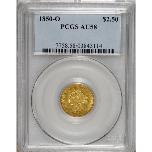 <B>1850-O $2 1/2 AU58 PCGS.</B></I> A still-lustrous butter-yellow piece with traces of orange and green in the slightly frosty fields. Minimally marked with just a trace of friction, though this issue's notoriously poor strike is evident on the ill-defined devices. Population: 5 in 58, 13 finer (3/07).<BR><BR><b>Shipping:</b> Coins & Currency (<a target="_blank" href="http://www.heritageauctions.com/common/shipping.php">view shipping information</a>)