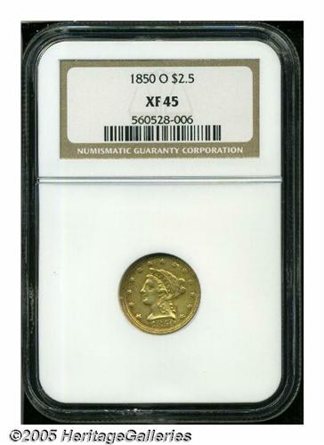 <B>1850-O<$2 1/2> XF45 NGC.</B></I> The '50-O is genuinely scarce in al grades despite the impressive mintage of 84,000 pieces. Honey-gold surfaces show traces of red and tan, and are quite clean with no significant marks beyond what is expected for the grade. Both obverse and reverse devices are softly impressed, which is usual for the issue.