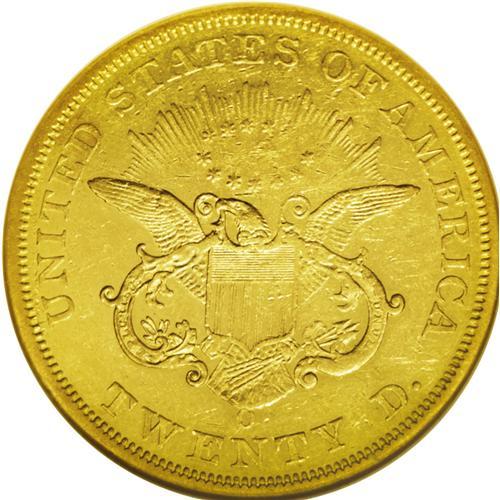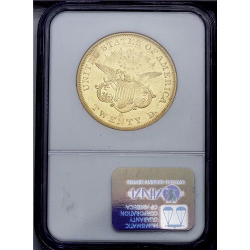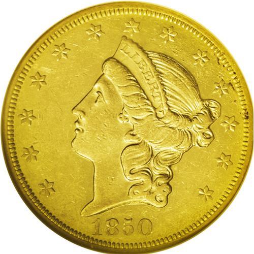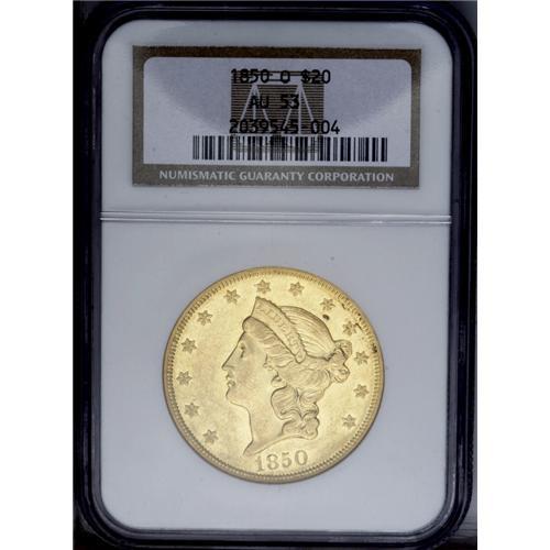 <B>1850-O<$20> AU53 NGC.</B></I> This is an example of the "High Mintmark" variety, briefly mentioned by Bowers in <I>A Guide Book of Double Eagle Gold Coins.</B></I> See the further discussion below. In 1835, Congress authorized branch Mints in Charlotte, North Carolina, Dahlonega, Georgia, and New Orleans, Louisiana. The Charlotte and Dahlonega Mints were only intended to produce gold coinage, while the New Orleans Mint was also authorized to coin silver, as well. At the time, massive discoveries of gold in California were not even imagined, and most gold arriving for coinage in New Orleans was from South and Central America. By 1850, the scene had changed and gold from the California gold fields was keeping New Orleans Mint personnel plenty busy. Production of double eagles began at once, and these large gold coins became the principal denomination of the New Orleans Mint.<BR> There exist two distinctly different mintmark positions, indicating that both reverse dies sent to New Orleans for the 1850-O double eagle coinage were actually used. This example has a large O mintmark joined to the eagle's tail, while some others have the mintmark about centered between the tail and the N of TWENTY. This example also represents Breen's Heavy Date variety with a Closed 5. It is a splendid representative from the heyday of New Orleans coinage operations. The surfaces have bright yellow gold with greenish tendencies. Both sides have the usual scattered surface marks and faint blemishes, with traces of rust colored verdigris along the obverse border at 2 o'clock. Nearly full mint luster remains, with reflective fields that were once fully prooflike. When it was first minted, this example must have been glorious.<BR><I>From The Wyoming Collection.</B></I>