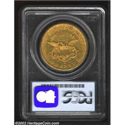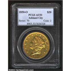 1850-O $20 AU53 PCGS. Regular issue Double Eagle production commenced in 1850 at both the Philadelphia and New Orleans Mints. The total delivery at the latter facility amounted to 141,000 coins. This issue is not particularly rare in an absolute sense, and enough VF-XF examples are extant to satisfy less discerning first-year type collectors. In About Uncirculated, however, the '50-O is rare with the present AU53 survivor knocking on the door of a Condition Census ranking. Pleasingly original, both sides are richly colored in olive-gold shades that brighten to orange-gold as the surfaces dip into the light. The strike, while not full, is well above average for the issue with the most impressive definition noted over the date and obverse star centrils. Moderately abraded with appreciable remnants of a semi-prooflike finish. A tiny cut on the reverse rim above the O in OF and a few sprays of crimson-copper color around the same letter are mentioned as pedigree markers.From the Ashland City Collection. Important notice: We expect to be auctioning lots at the rate of 200-250 per hour. Sometimes eBay Premier live bid software cannot keep up with that pace, so we strongly recommend that you place a realistic proxy bid now as insurance to avoid disappointment. Also please note that all Heritage/CAA lots purchased through eBay Premier carry a 20% Buyer's Premium. Please make sure you read the Terms and Conditions.