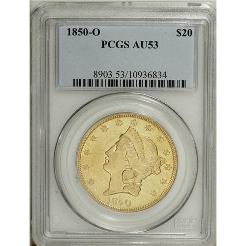 <B>1850-O $20 AU53 PCGS.</B></I> Winter termed this "a hard issue to locate" in About Uncirculated and finer grades, and this is especially true for pieces with solid eye appeal. Such an example is offered here. The yellow-gold surfaces have a trace of orange and significant luster, though the also display light wear and a number of handling marks. Still, appealing overall. Population: 14 in 53, 17 finer (12/06).<BR><BR><b>Shipping:</b> Coin/Currency (<a target="_blank" href="http://www.heritageauctions.com/common/shipping.php">view shipping information</a>)
