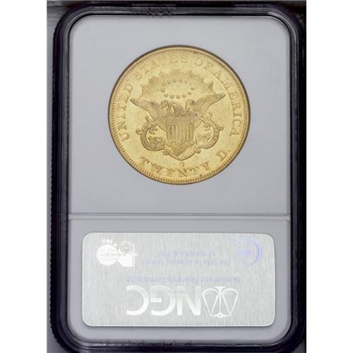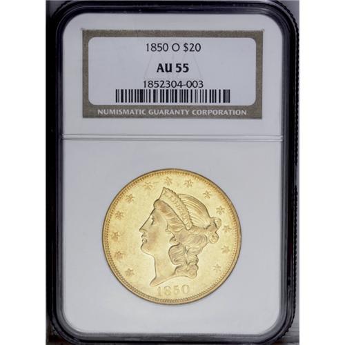 <B>1850-O<$20> AU55 NGC.</B></I> A lovely representative of the introductory New Orleans double eagle issue. Bright luster individually illuminates the obverse stars, and luster also glows from Liberty's coronet and the reverse devices. The strike is consistent, and a hint of wear on the portrait highpoints is consistent with the grade. Best of all, there are no rim bruises, scratches, or obtrusive bagmarks. Demand from O-mint type sets pressures even the collectible '50-O to '53-O issues. Census: 38 in 55, 12 finer (9/06).