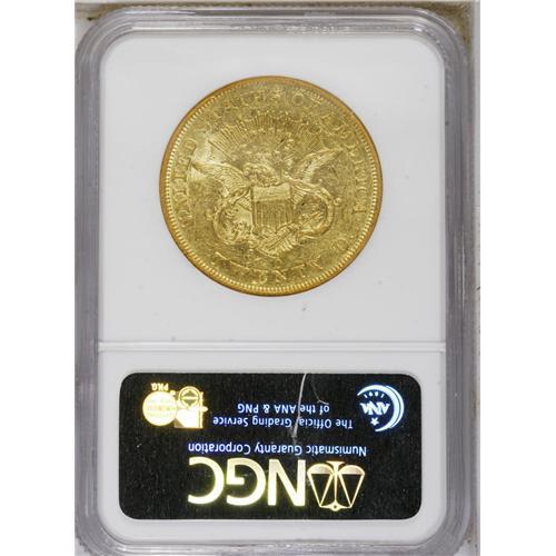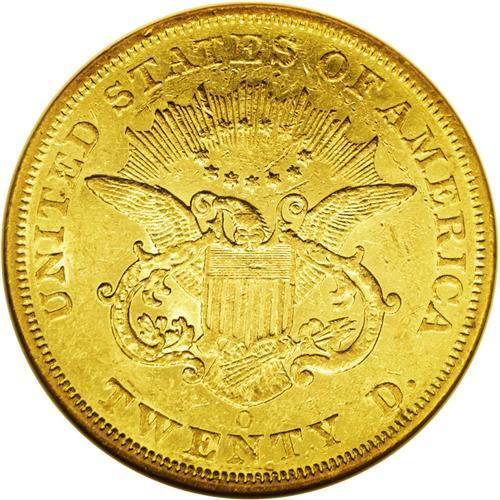 <B>1850-O<$20> AU55 NGC.</B></I> Beginning in 1850 with the advent of this denomination, and continuing through 1853, just prior to the first coinage at the new San Francisco Mint, it was the joint responsibility of the Philadelphia and New Orleans Mints to handle the influx of new gold that was mined in California. It is interesting to consider just what quantity of gold this entailed, so we will turn to some basic bookkeeping. From 1840 through 1849, all of the Mints converted approximately 285,000 troy ounces of gold into coinage on an annual basis. Then, from 1850 to 1854, the average annual production was just over 2 million troy ounces of gold. Thus, the California gold rush generated approximately 1.7 million troy ounces of gold each year, not counting the unknown quantity that was converted to gold bars or to privately issued gold coinage. This is a pleasing green-gold example with lightly abraded surfaces as usual. Both sides have nearly full luster with reflective fields.