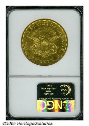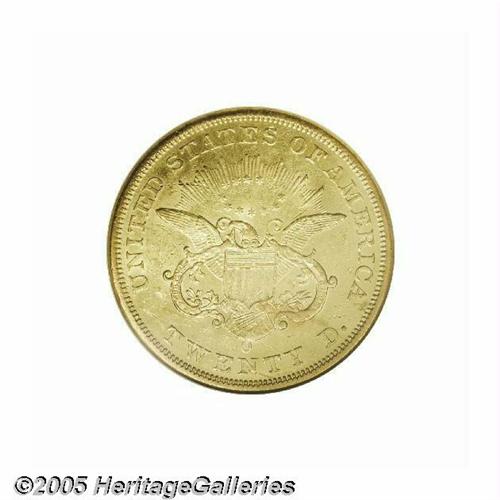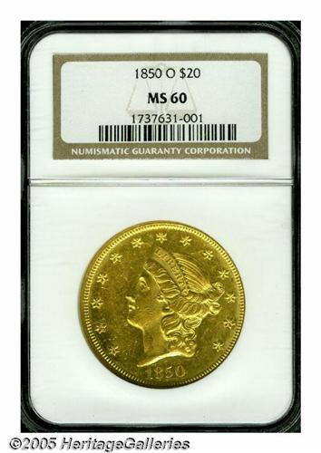 <B>1850-O<$20> MS60 NGC.</B></I> One of the most popular dates and the first year of issue for this denomination from the New Orleans Mint. The surfaces show scattered handling ticks expected for the grade, and the strike is generally sharp save for the uppermost hair curls. Quite lustrous in the fields, and the surfaces are a delightful bright yellow-gold color. A loupe will note scattered handling marks, but Liberty's face remains attractive for the grade. This particular coin is identifiable by a minor nick on the fifth vertical shield line (of six lines) counting from the left. The O mintmark is slightly doubled low and touches the eagle's tail. As a date, this New Orleans issue saw heavy commercial use, and precious few were saved in grades even approaching mint state. A glance at the Population reports will confirm this, PCGS has yet to grade even a single coin of this date in any grade of Mint State, while NGC has graded just 5 examples at that level, three as MS60, one as MS61 and the best as MS62. Needless to say, this particular coin deserves spirited bidding.<BR><I>From The Edward O'Neill Collection of Liberty Double Eagles.</B></I>