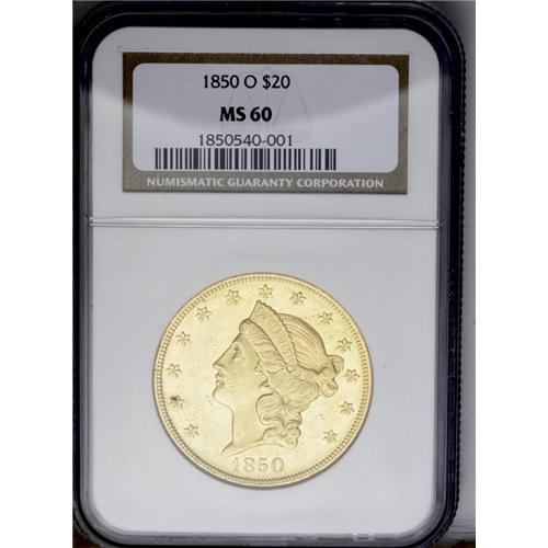 1850-O $20 MS60 NGC. The 1850-O, sporting a mintage of 1850-O