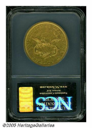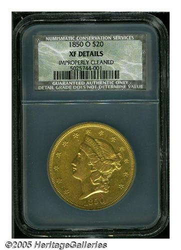 <B>1850-O<$20> XF Details, Improperly Cleaned, NCS.</B></I> A subdued first year New Orleans Double Eagle, Liberty's hair has limited wear but luster glows from portions of the stars, legends, and devices. A few tiny areas of granularity are noted near the date, and a minor obverse rim ding is at 6 o'clock.