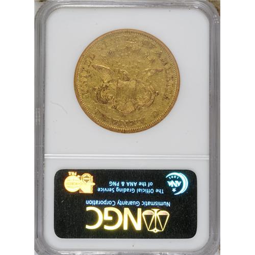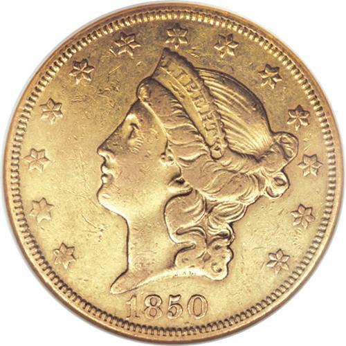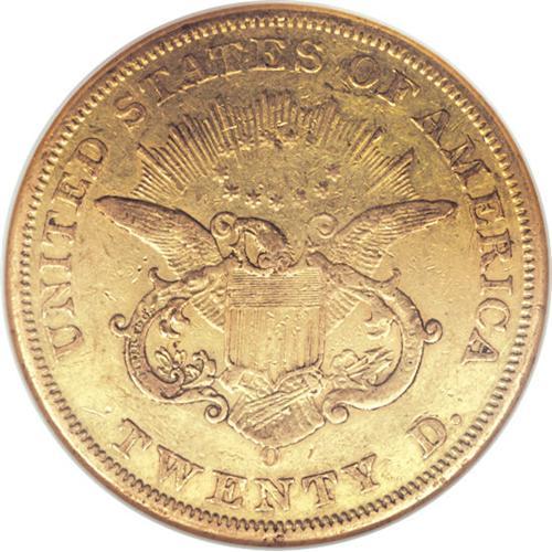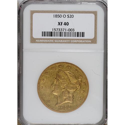 <B>1850-O $20 XF40 NGC.</B></I> Most remaining 1859-O double eagles exist in Very Fine to About Uncirculated grade. Uncirculated coins are rare; PCGS has seen none, and NGC has graded four, all in the lower grades of Mint State. Bright yellow-gold surfaces characterize this XF40 example that displays relatively good design detail, though portions of Liberty's hair are worn. The few minute marks scattered about are not serious.<BR><BR><b>Shipping:</b> Coins & Currency (<a target="_blank" href="http://www.heritageauctions.com/common/shipping.php">view shipping information</a>)