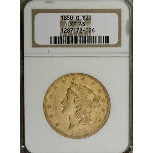 <B>1850-O $20 XF45 NGC.</B></I> Most survivors of the 1850-O 141,000-piece mintage are in the VF to AU grade ranges. Traces of luster cling to the design elements of this Choice XF example, and yellow-gold surfaces give hints of light green tints. The motifs are well defined for the most part on what is usually a softly struck issue. Some minute contact marks are noted over each side.<BR><BR><b>Shipping:</b> Coins & Currency (<a target="_blank" href="http://www.heritageauctions.com/common/shipping.php">view shipping information</a>)