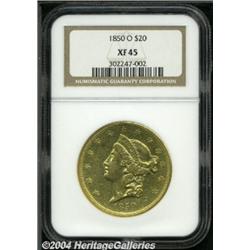 <B>1850-O<$20> XF45 NGC.</B></I> Light in color with the usual green-gold alloy and ample luster in the protected areas. Liberty's curls show softness from a combination of strike and wear. Numerous small bagmarks are reported over each side. <BR><BR><B>Important notice:</B> Heritage usually auctions material at the rate of 200-250 lots per hour. On some occasions eBay Live bid software or the Internet may not be able to keep up with the pace of the auction. We recommend placing a realistic absentee bid now as insurance to avoid disappointment. Occasionally the auctioneer may eliminate or reject an eBay Live bid, and the auctioneer may also reopen a lot after the close of the eBay live bidding (usually because we missed an audience bid), and may reject your bid even if it shows you as the winning bidder. By bidding via eBay Live, you agree that Heritage may award the lot to another bidder at its sole discretion under the circumstances described above or any other reasonable circumstances. Since eBay bids are not shown to us until we open the lot on the floor, we treat those bids just like floor bids. In most cases the floor responds before the eBay bid is presented to us, due to Internet lag time, so for consistency we have made it a policy that floor bids are always considered first over tie eBay live bids. Also please note that all Heritage lots purchased through eBay Live carry a 20% Buyer's Premium. Please make sure you read the Terms and Conditions before you bid. </span></font></tr></table></td></tr></table>