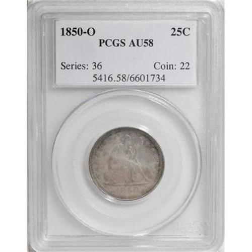 <B>1850-O 25C AU58 PCGS.</B></I> Deep milky-gray toning envelops the mildly granular surfaces of the obverse, while speckles of reddish-gold patina visit the fully lustrous reverse. Well struck throughout, and nicely preserved, save for a hair-thin mark on the upper obverse. Population: 8 in 58, 13 finer (3/08).<BR><BR><B>Coin Engraver:</B> Christian Gobrecht<BR><BR><b>Shipping:</b> Coins & Currency (<a target="_blank" href="http://www.heritageauctions.com/common/shipping.php">view shipping information</a>)