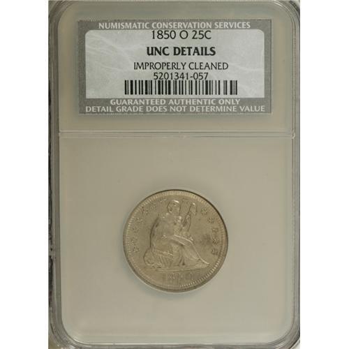 <B>1850-O 25C --Improperly Cleaned--NCS. Unc Details.</B></I> While this issue has a comparatively high mintage of 412,000 pieces, it experienced considerable attrition through circulation and export. A thin wash of blue-gray patina covers each side of this unworn and well struck antebellum quarter. The fields have muted, uniform luster.<BR><BR><b>Shipping:</b> Coins & Currency (<a target="_blank" href="http://www.heritageauctions.com/common/shipping.php">view shipping information</a>)
