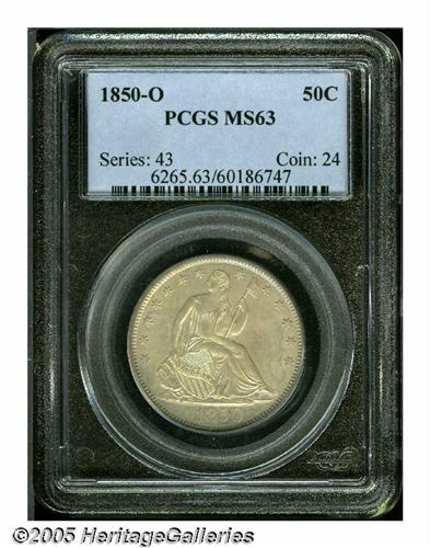 <B>1850-O<50C> MS63 PCGS.</B></I> Lustrous surfaces display pastel ice-blue, beige, and faint lilac patina. The design elements are well executed, though the last two stars along the lower right (facing) border are a trifle soft. A few grade-limiting marks are noted on Liberty's portrait and in the left (facing) obverse field.