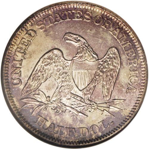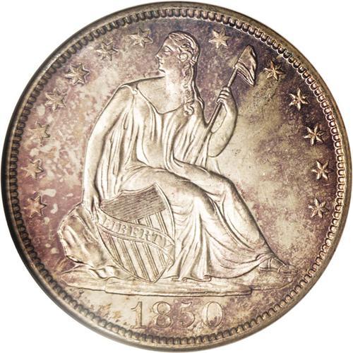 <B>1850-O<50C> MS64 NGC.</B></I> Richly toned with purple-violet and golden-tan colors. A well struck example with a nearly pristine obverse and a carefully preserved reverse. The obverse stars are strike doubled. Desirable both as a variety and as a type coin. Like most New Orleans halves from this era the '50-O is a challenging coin in Mint State, and is especially difficult as a near-Gem. Census: 21 in 64, 8 finer (2/06).<BR><I>From The Frank DuVall Collection.</B></I>