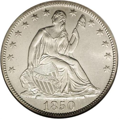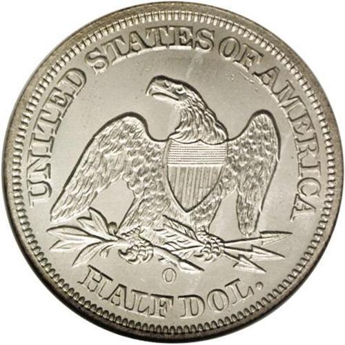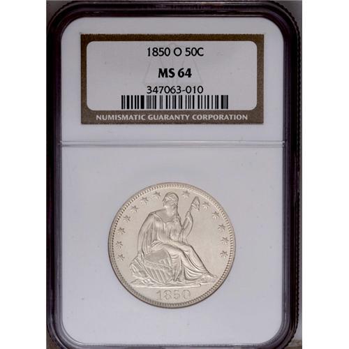 <B>1850-O<50C> MS64 NGC.</B></I> This exactingly struck near-Gem approaches full definition, lacking only on the upper portion of Liberty's hair. Vibrant satin luster bathes uncommonly clean fields. A couple of thin milk-white streaks cross the reverse, but these have little effect on the eye appeal. Census: 22 in 64, 8 finer (4/06).