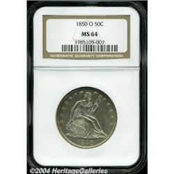 <B>1850-O<50C> MS64 NGC.</B></I> Honey-gold color hugs the borders of this boldly struck and satiny near-Gem, while the reverse features a few faint streaks of milky tan-brown patina. Nearly undisturbed by contact, and of interest to the dedicated specialist. A diagonal die line on Liberty's throat is strictly of mint origin. Population: 17 in 64, 8 finer (6/04). <BR><BR><B>Important notice:</B> Heritage usually auctions material at the rate of 200-250 lots per hour. On some occasions eBay Live bid software or the Internet may not be able to keep up with the pace of the auction. We recommend placing a realistic absentee bid now as insurance to avoid disappointment. Occasionally the auctioneer may eliminate or reject an eBay Live bid, and the auctioneer may also reopen a lot after the close of the eBay live bidding (usually because we missed an audience bid), and may reject your bid even if it shows you as the winning bidder. By bidding via eBay Live, you agree that Heritage may award the lot to another bidder at its sole discretion under the circumstances described above or any other reasonable circumstances. Since eBay bids are not shown to us until we open the lot on the floor, we treat those bids just like floor bids. In most cases the floor responds before the eBay bid is presented to us, due to Internet lag time, so for consistency we have made it a policy that floor bids are always considered first over tie eBay live bids. Also please note that all Heritage lots purchased through eBay Live carry a 20% Buyer's Premium. Please make sure you read the Terms and Conditions before you bid. </span></font></tr></table></td></tr></table>