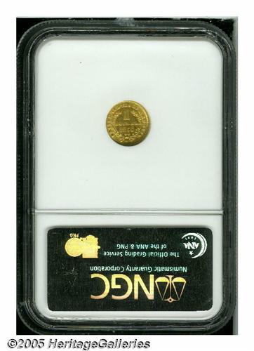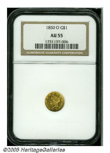 <B>1850-O<G$1> AU55 NGC.</B></I> A lightly circulated but partly lustrous New Orleans Gold Dollar, scarcer than other issues from the southern branch mint since just 14,000 pieces were struck. A pinscratch behind the hair bun and an abrasion beneath the bust prevent a finer grade.