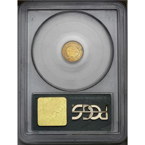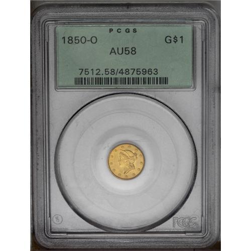 <B>1850-O G$1 AU58 PCGS.</B></I> A lemon-gold example that has a dash of gray patina near the M in AMERICA. An inconspicuous mark on the cheek, otherwise pleasing. The 1850-O is by far the lowest mintage O-mint Type One Gold Dollar; just 14,000 pieces were produced. Housed in a green label holder. Population: 11 in 58, 16 finer (12/05).