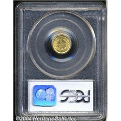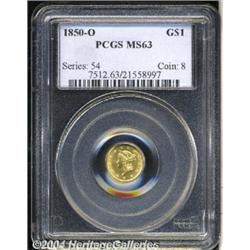 <B>1850-O<G$1> MS63 PCGS.</B></I> The 1850-O is by far the most challenging of the New Orleans Mint Gold Dollar issues, as could be predicted by the mintage of only 14,000 pieces. This sharply detailed example is modestly abraded and displays especially vibrant, satiny luster. Population: 5 in 63, 1 finer (4/04). <BR><BR><B>Important notice:</B> Heritage usually auctions material at the rate of 200-250 lots per hour. On some occasions eBay Live bid software or the Internet may not be able to keep up with the pace of the auction. We recommend placing a realistic absentee bid now as insurance to avoid disappointment. Occasionally the auctioneer may eliminate or reject an eBay Live bid, and the auctioneer may also reopen a lot after the close of the eBay live bidding (usually because we missed an audience bid), and may reject your bid even if it shows you as the winning bidder. By bidding via eBay Live, you agree that Heritage may award the lot to another bidder at its sole discretion under the circumstances described above or any other reasonable circumstances. Since eBay bids are not shown to us until we open the lot on the floor, we treat those bids just like floor bids. In most cases the floor responds before the eBay bid is presented to us, due to Internet lag time, so for consistency we have made it a policy that floor bids are always considered first over tie eBay live bids. Also please note that all Heritage lots purchased through eBay Live carry a 20% Buyer's Premium. Please make sure you read the Terms and Conditions before you bid.