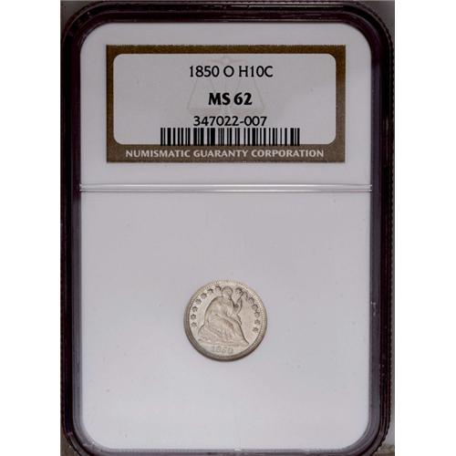 <B>1850-O<H10C> MS62 NGC.</B></I> V-2. Large O. The muted overall appearance seems to account for the grade, but the surfaces are smooth and remarkably well impressed for an O-mint example. Struck from a clashed obverse die. This issue probably experienced widespread melting as the price of silver continued to rise as a result of the Gold Rush. Census: 10 in 62, 24 finer (4/06).