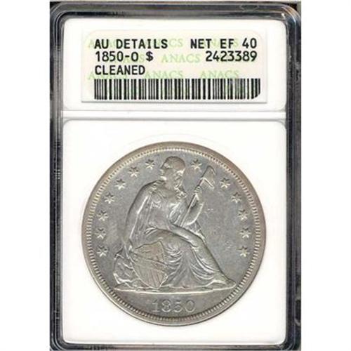 <b>1850-O Liberty Seated Dollar. ANACS graded AU Details. Net EF40 Cleaned.</b> A few light marks on the legs. With only 20,000 minted, and the valuable O-mintmark appended to the reverse, this 1850-O rarity is well liked within numismatic circles. The present offering, while clearly having been cleaned at one time and left in a light silvery colored state of preservation, yet has all the distinctive qualities of the Net grade. If you gather from what we say that it is still desirable, then it should prove enticing to many bidders, who know the circumstances behind its rarity <b>(PCGS # 6938)</b>