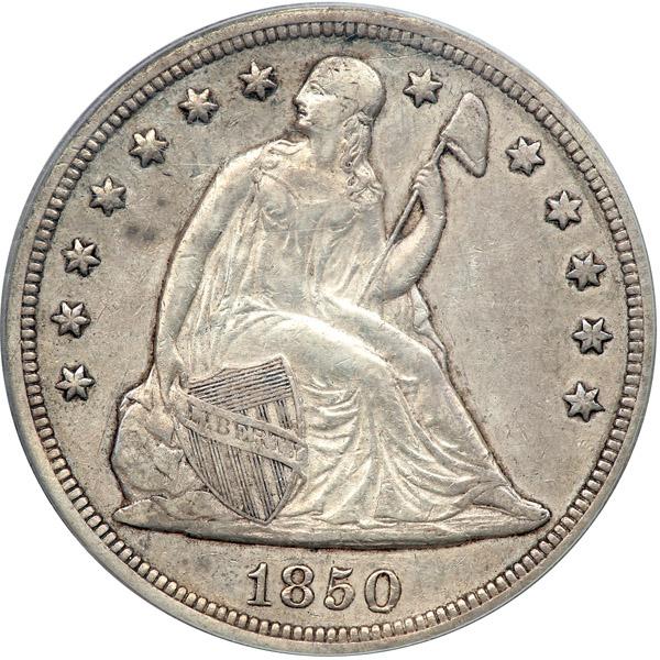 1850-O Liberty Seated Dollar. PCGS graded AU-50. Only 40,000 struck. Even gray toning with splendid frosty texture. New Orleans Mint struck only three O-mint dates in the series, 1850-O, 1859-O and 1860-O. The 1850-O is one of this America's favorite issues in the entire Seated Dollar series. Federal records report a not overly generous mintage, and domestic circulation throughout the antebellum South undoubtedly took a toll on this delivery. Examples, therefore, are scarce in all grades. The '50-O is also a prime condition rarity, with AU coins being elusive in today's market. Add to this the fact that so many 1850-O Dollars have been dipped or cleaned and one can easily understand the desirability of the fresh, original toned specimen offered. Pop 22; 37 finer (PCGS # 6938) .
