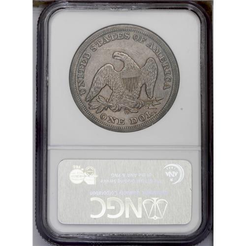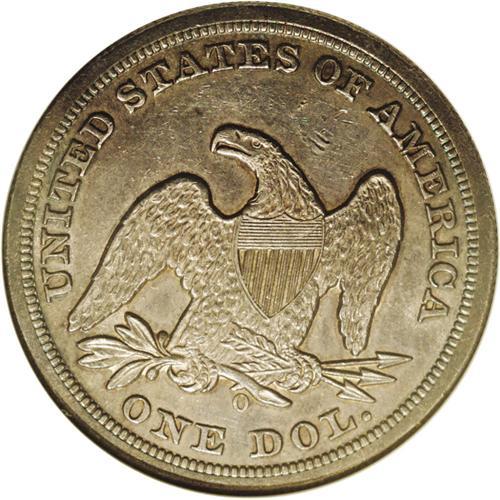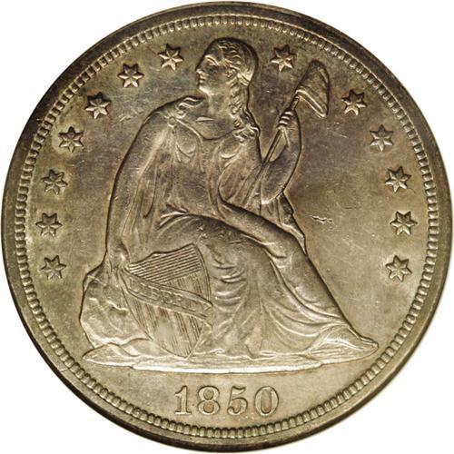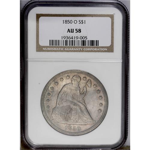 <B>1850-O<img border='0' src='http://www.heritagecoins.com/images/star.gif' width=10 height=10>$1> AU58 NGC.</B></I> The surfaces on this uncommon high grade 1850-O dollar exhibit relatively few abrasions and much remaining luster. Areas of steel-gray toning cling to selected areas on both sides. Several milling marks are noted: one in the right obverse field, another on Liberty's chest, and a small group above the eagle's neck. An important offering for the New Orleans or Seated dollar enthusiast. <BR><BR><B>Important notice:</B> Heritage usually auctions material at the rate of 200-250 lots per hour. On some occasions eBay Live bid software or the Internet may not be able to keep up with the pace of the auction. We recommend placing a realistic absentee bid now as insurance to avoid disappointment. Occasionally the auctioneer may eliminate or reject an eBay Live bid, and the auctioneer may also reopen a lot after the close of the eBay live bidding (usually because we missed an audience bid), and may reject your bid even if it shows you as the winning bidder. By bidding via eBay Live, you agree that Heritage may award the lot to another bidder at its sole discretion under the circumstances described above or any other reasonable circumstances. Since eBay bids are not shown to us until we open the lot on the floor, we treat those bids just like floor bids. In most cases the floor responds before the eBay bid is presented to us, due to Internet lag time, so for consistency we have made it a policy that floor bids are always considered first over tie eBay live bids. Also please note that all Heritage lots purchased through eBay Live carry a 20% Buyer's Premium. Please make sure you read the Terms and Conditions before you bid. This lot is being auctioned in conjunction with a live floor auction by Heritage Galleries & Auctioneers. All final auction and invoice information will be supplied by Heritage Galleries & Auctioneers, and all other information should be considered preliminary. Lot:2178 <BR><BR><B>Winning Notification and Billing:</B> After the FINAL session in this auction is complete, Heritage will send e-mail and snail mail invoices. This process normally takes several days. All final auction and invoice information will be supplied by Heritage Galleries & Auctioneers, and all other information should be considered preliminary. <BR><BR>This auction will be conducted on a live auction floor and over the Internet through eBay Live. If you choose to place an absentee bid, please take a moment to <font color='#0000ff'><u><a href='http://pages.ebay.com/liveauctions/help/before/laabsentee.html'>learn how eBay Live absentee bidding works</a></u></font><font color='#000000'>