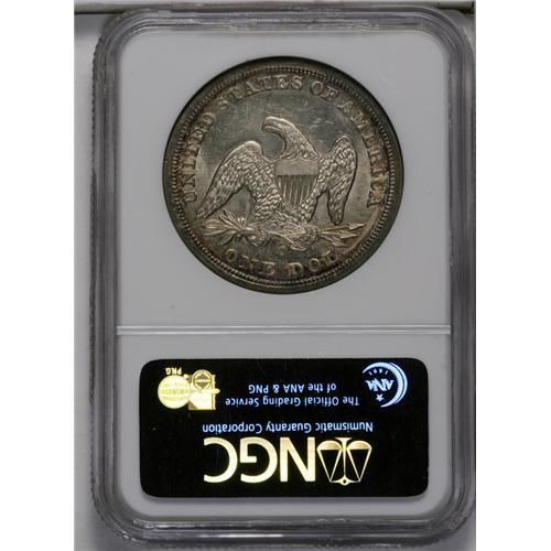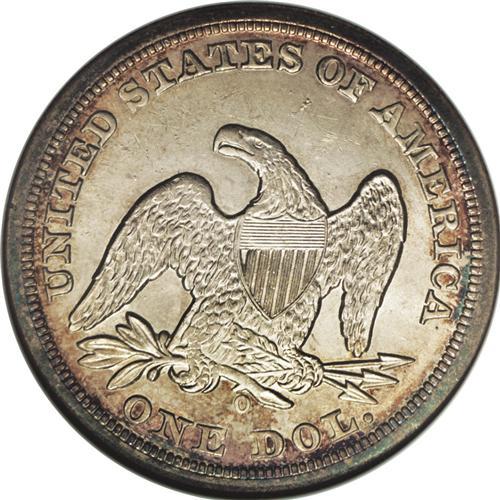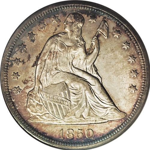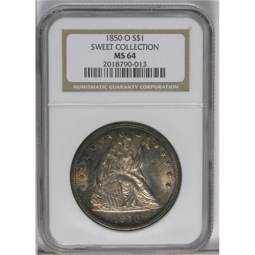 <B>1850-O<img border='0' src='http://www.heritagecoins.com/images/star.gif' width=10 height=10>$1> MS64 NGC.</B></I> Ex: Sweet Collection. The New Orleans Mint struck four dates of the Liberty Seated dollar series, all before the addition of the motto IN GOD WE TRUST in 1866. Of those four, the 1859-O and 1860-O are common, by the measure of the series, in Mint State. However, the 1846-O--and especially the 1850-O--are seldom encountered in Uncirculated grades. Only 40,000 pieces of the 1850-O were struck. In the March 1979 <I>Gobrecht Journal</B></I> (as quoted in the Bowers-Borckardt silver dollar reference), Bruce Lorich wrote of his review of 100 years of auction records, concluding that Mint State specimens of the 1850-O appeared less often at auction than any other Seated Liberty dollars except the 1855, 1870-S, 1871-CC, and the "non-existent 1873-S." The Bowers-Borckardt reference also says "... it may be years, if ever, until you can buy a nice Mint State coin. Examples are few and far between."<BR> Examination of the combined NGC and PCGS population data is also instructive. NGC has certified 15 Mint State examples, with four MS64 pieces the finest. PCGS has graded 11 Mint State pieces, the finest a single MS64 specimen (6/06). In other words, <B>this lovely MS64 piece ties with four others at NGC and PCGS together at the top of the Condition Census of certified coins.</B></I><BR> The present near-Gem offers light copper-gold and steel-blue toning near the borders. The fields and devices are nearly brilliant, with a slight golden cast. The strike is good if not exacting, with slight softness seen only on the eagle's head and a few star centers. Abundant luster emanates from both sides, and there are light signs of die rust noted in the upper left reverse field. If Seated Liberty dollars are your passion, this piece will provide a radiant, crowning masterpiece to your collection. Don't wait: it is doubtful that this opportunity will repeat itself soon, <I>if e