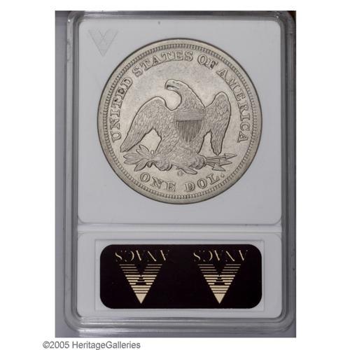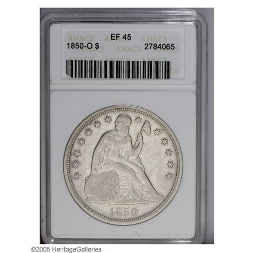 <B>1850-O<S$1> XF45 ANACS.</B></I> The scarcest of the four dates minted in New Orleans of the Seated Dollar series. In fact, with a mintage of only 40,000 pieces, it is a scarce date at any grade level. The present coin has a pleasing, lightly circulated appearance, with dove-gray surfaces and faintly reflective fields.<BR><I>From The Ross Bailey Collection.</B></I>