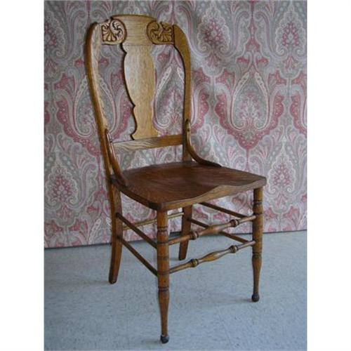 This beautiful 1850 Queen Anne style vanity chair was presented at the estate auction of a local woman. While its condition was quite good, Preservation Project artisans felt it deserved to be perfected. Its quality characteristics include deep double divided press designs flanking the Queen Anne style slat back, intricately turned legs, quarter sawn oak frame and contoured seat.