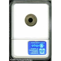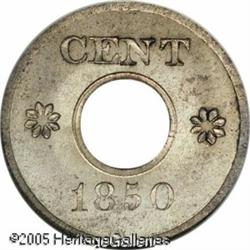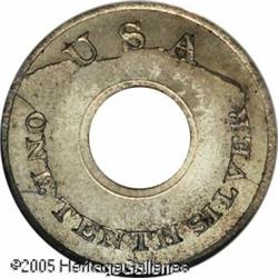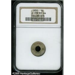 <B>1850 P1C One Cent, Judd-119 Original, Pollock-134, Low R.6, PR64 NGC.</B></I> The obverse displays the denomination CENT at the top, the date 1850 at the bottom, two rosettes at the sides, and a perforation in the center. The central reverse is also perforated with the inscriptions USA and ONE TENTH SILVER around. Struck in billon (10% silver, 90% copper) with a plain edge. The reverse was struck from a shattered die, as were most extant representatives of this scarce pattern. This richly toned example is awash in mottled olive-gray and slate-gray shades. There are no abrasions of note, and, if the surfaces were more lustrous, this coin would probably net a higher grade. Lot:9822