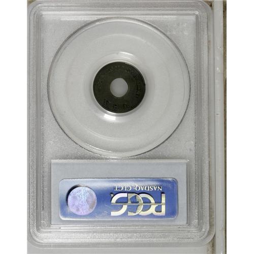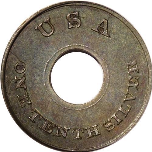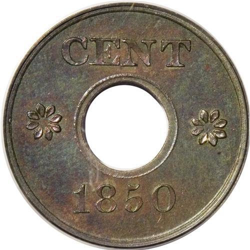 <B>1850 P1C One Cent, Judd-119 Original, Pollock-134, Low R.6, PR65 PCGS.</B></I> The obverse displays the denomination CENT at the top, the date 1850 at the bottom, two rosettes at the sides, and a perforation in the center. The reverse has the inscriptions USA and ONE TENTH SILVER around. Struck in billon (10% silver, 90% copper) with a plain edge. According to Andrew Pollock, these patterns were made in response to Congressman Sam F. Vinton of the House Ways and Means Committee's bill drafted in 1849 to reduce the size of the one cent piece. The perforated billon pieces are believed to be original strikings, but it is unclear if the pieces with die cracks are original or restrikes. This piece is mostly blue-brown with only slight remnants of original red remaining. <BR><BR><b>Shipping:</b> Coins & Currency (<a target="_blank" href="http://www.heritageauctions.com/common/shipping.php">view shipping information</a>)