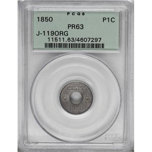 <B>1850 P1C One Cent, Judd-119 Original, Pollock-134, Low R.6, PR63 PCGS.</B></I> The obverse displays the denomination CENT at the top, the date 1850 at the bottom, two rosettes at the sides, and a perforation in the center. The shattered reverse has the inscriptions USA and ONE TENTH SILVER around. Struck in billon (10% silver, 90% copper) with a plain edge. A dove-gray example with glimpses of olive and lavender toning. The surfaces are subdued, but are free from abrasions or spots. Certified in a green label holder.<BR><I>From The Madison Collection.</B></I><BR><BR><b>Shipping:</b> Coins & Currency (<a target="_blank" href="http://www.heritageauctions.com/common/shipping.php">view shipping information</a>)
