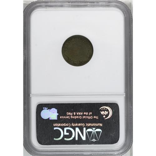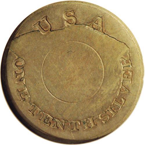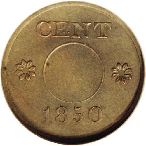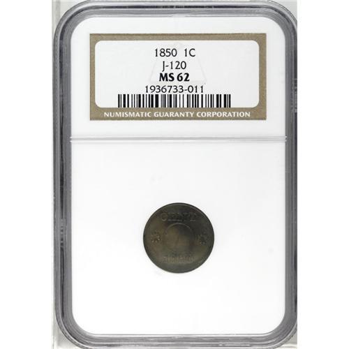 <B>1850<P1C> One Cent, Judd-120 Restrike, Pollock-135, High R.7, MS62 NGC.</B></I> This annular pattern design was an early attempt by the Mint to reduce the cumbersome size of the contemporary Large Cent. Struck in billon alloy (10% silver, 90% copper) with a plain edge. From the same dies as Judd-119, but the centers are not perforated. This rare pattern is believed to be a restrike; presumably the 'midnight minters' lacked either the equipment or incentive to perforate the planchets prior to coining. Smooth, subdued surfaces display olive-gray patination. The reverse features heavy die cracks.