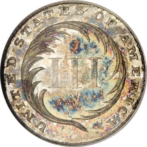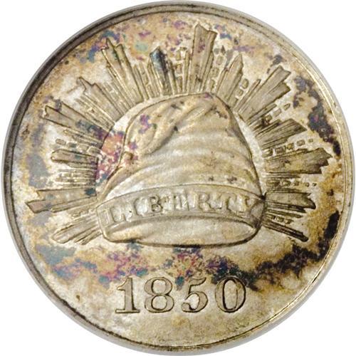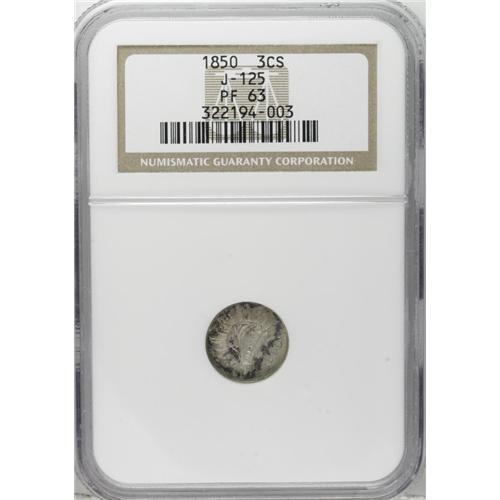<B>1850 P3CS Three Cent Silver, Judd-125 Original, Pollock-147, R.4, PR63 NGC.</B></I> On the obverse a glory of rays surrounds a cap inscribed LIBERTY, with the date below. On the reverse a palm branch encircles the denomination III with the legend UNITED STATES OF AMERICA around. Struck in silver with a plain edge. Considerable bright silver color on both sides is accented by attractive splashes of blue, gold, and iridescent toning.<BR><BR><b>Shipping:</b> Coin/Currency (<a target="_blank" href="http://www.heritageauctions.com/common/shipping.php">view shipping information</a>)