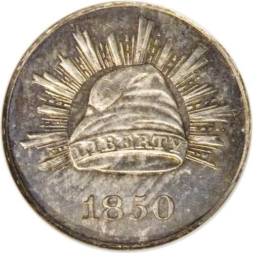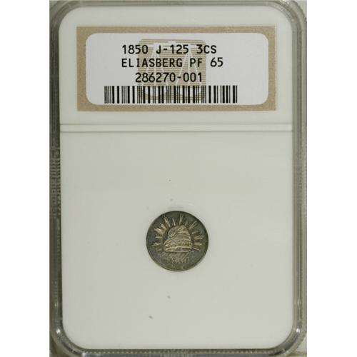 <B>1850 P3CS Three Cent Silver, Judd-125 Original, Pollock-147, R.4, PR65 NGC.</B></I> Ex: Eliasberg. On the obverse, a glory of rays surrounds a cap inscribed LIBERTY, with the date below. On the reverse, a palm branch encircles the denomination III with the legend UNITED STATES OF AMERICA around. Struck in silver with a plain edge. When this piece was offered as lot 156 of the May 1996 Eliasberg sale, the description emphasized its patina. "Golden gray and gunmetal-blue iridescence" remains an apt description of the surfaces of this diminutive but immensely appealing Gem, and its strong luster and provenance make it all the more desirable. Census: 2 in 65, 1 finer (12/06).<BR><BR><b>Shipping:</b> Coin/Currency (<a target="_blank" href="http://www.heritageauctions.com/common/shipping.php">view shipping information</a>)